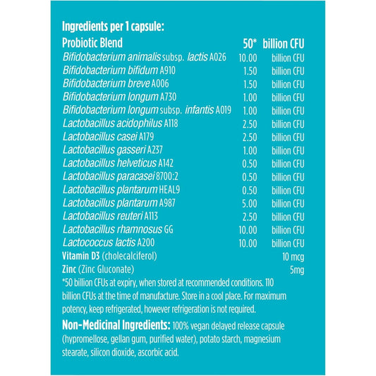 Genuine Health, Advanced Gut Health Probiotic 50 Billion CFU Daily Care Immune + Vitamin D and Zinc, 30 Vegan capsules