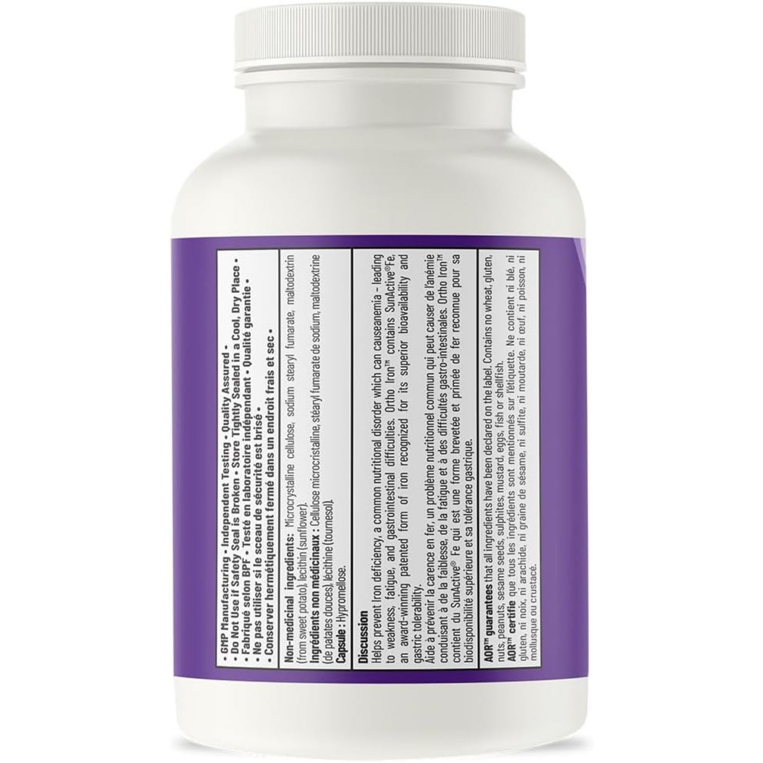 Ortho Iron contains SunActive®, a form of iron shown to be better absorbed and much easier to tolerate than other iron products. SunActive® contains ferric pyrophosphate, a type of iron that has been processed to reduce particle size for higher absorption, and is bound to a food grade emulsifier to prevent clustering. These two factors give it excellent bioavailability. Ortho Iron also contains several other nutrients that support iron absorption and prevent the oxidative effects associated with iron supplementation. These include Vitamin C, B6, B12, folate, lactoferrin and copper; all of which are crucial for iron absorption and utilization.