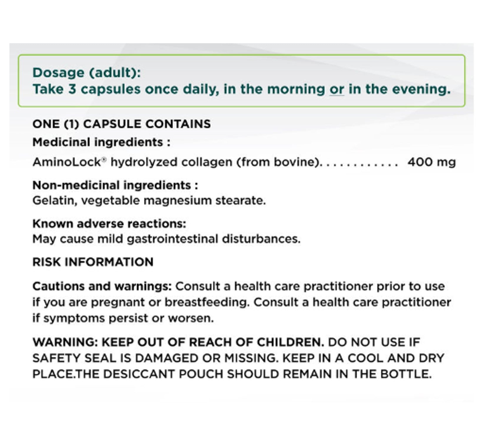 One dose (3 capsules) contains : Medicinal ingredients: AminoLock® Collagen (bovine source) : 1200 mg Non medicinal ingredients: Gelatin, vegetable magnesium stearate.