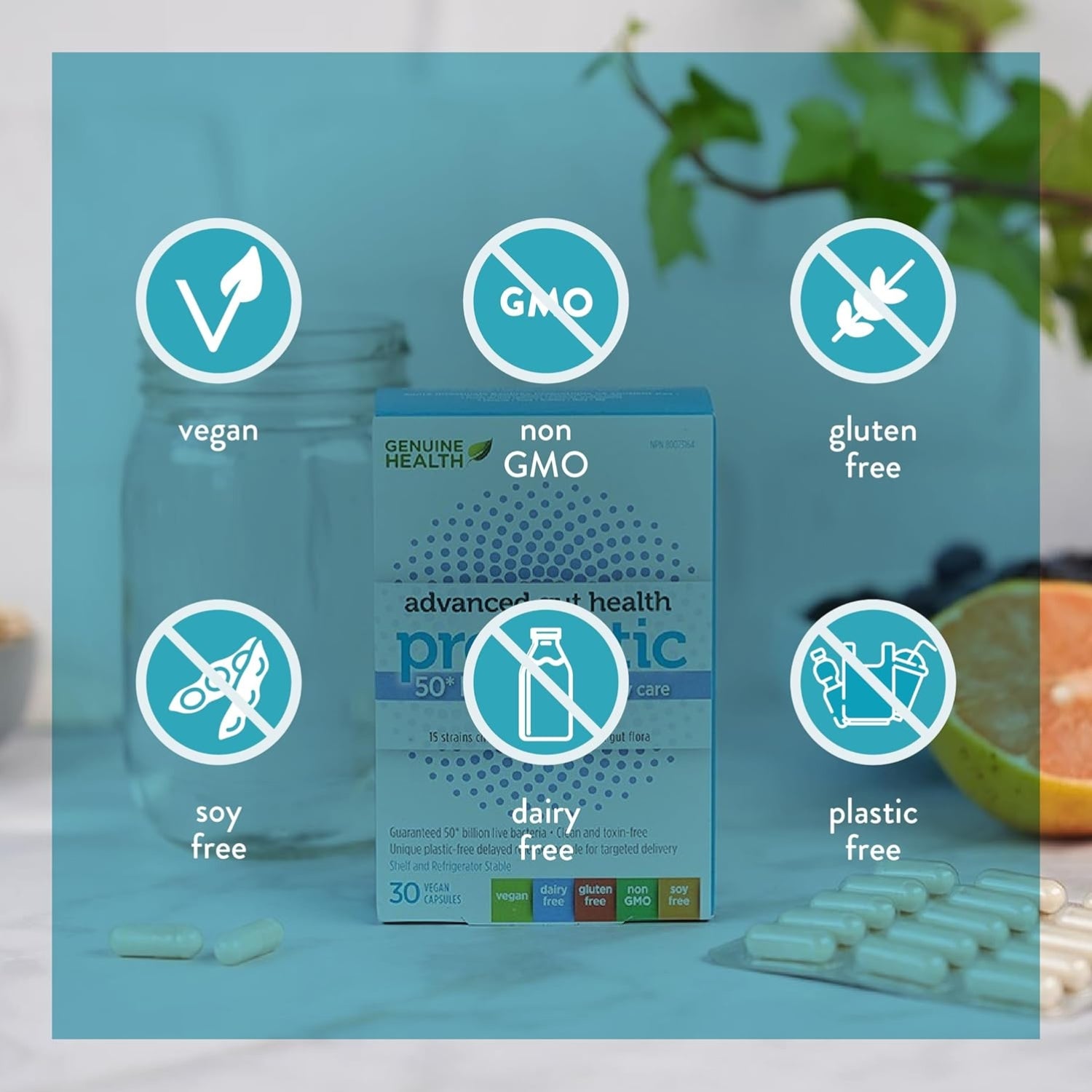 Genuine Health, Advanced Gut Health Probiotic 50 Billion CFU Daily Care Extra Strength, 60 Vegan capsules