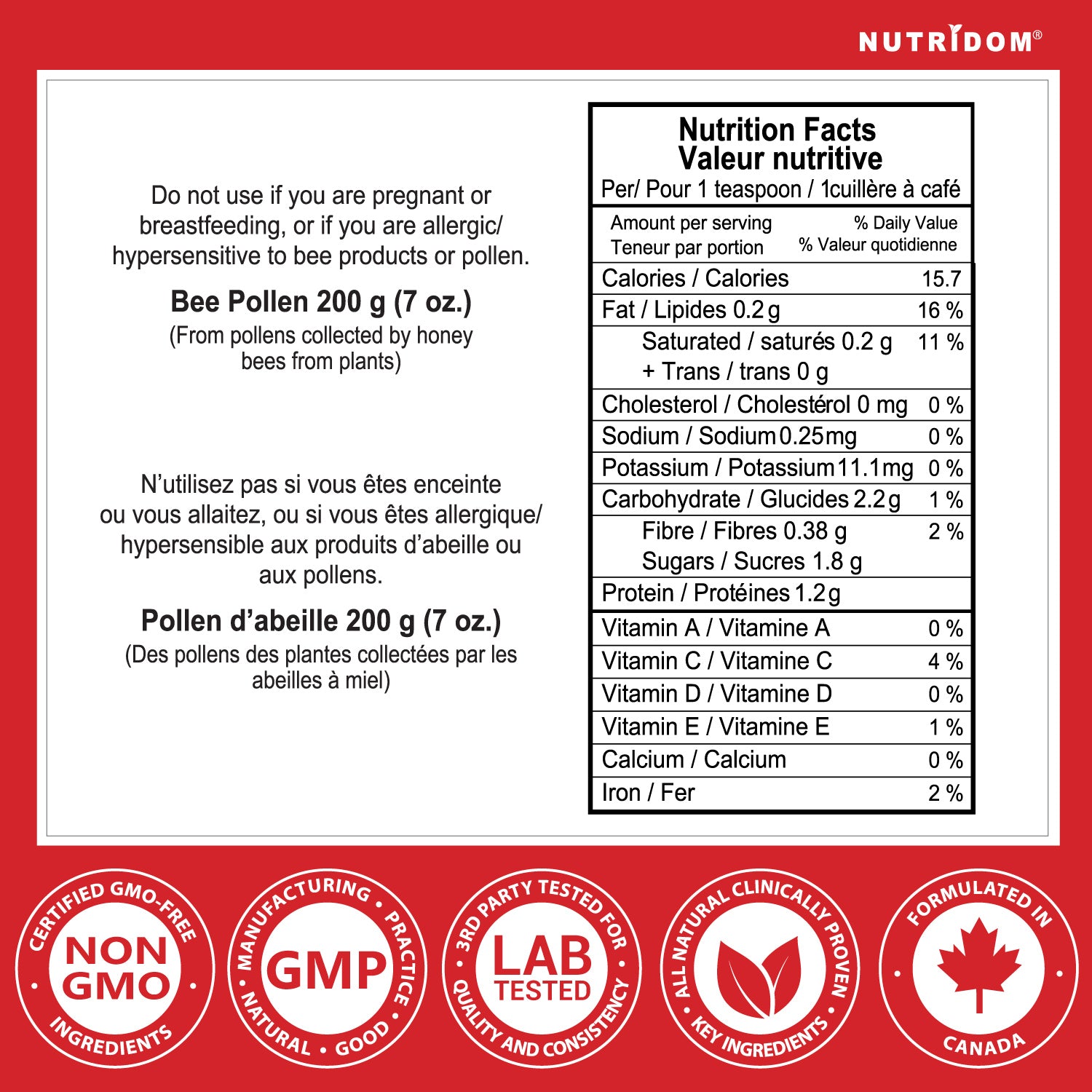 Warning: Do not use if you are pregnant or breastfeeding, or are allergic/hypersensitive to bee products.