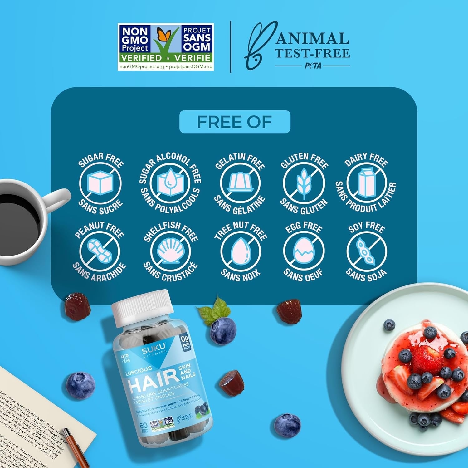 SUKU Vitamins Hair, Skin and Nails Multivitamin Gummies, Sugar Free, Keto, 2500mcg Biotin, Collagen, Silicon, Natural Gummy Vitamins for Healthy Skin and Hair Growth for Women and Men (60 Count)